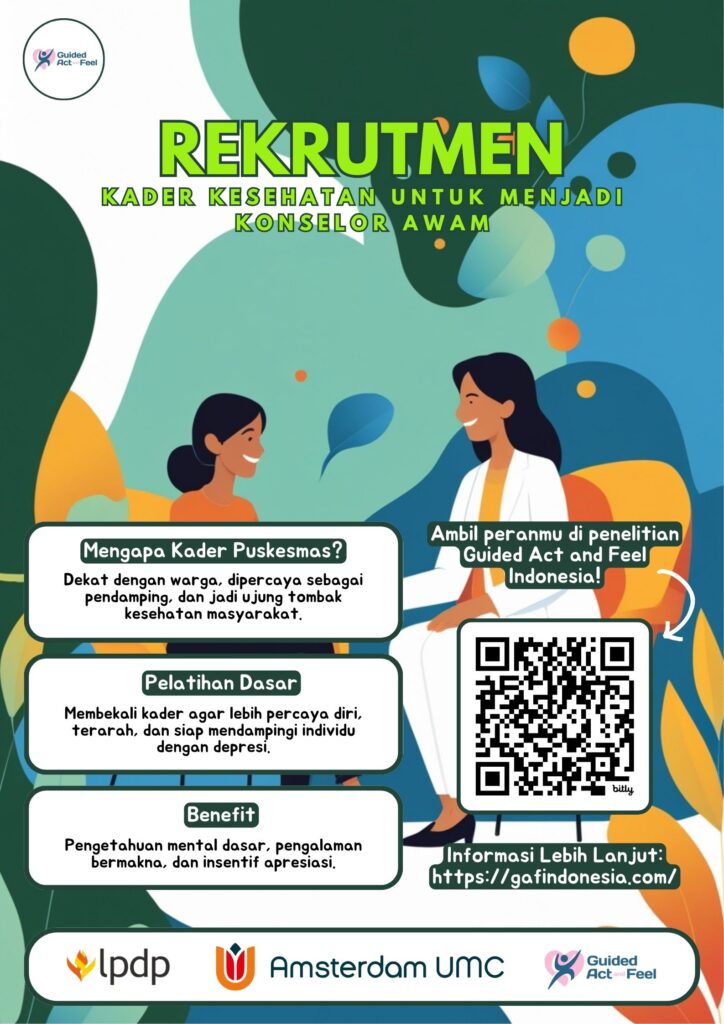 Kami dari Amsterdam University Medical Center sedang menjalankan sebuah proyek penelitian tentang kesehatan mental, khususnya untuk membantu orang yang mengalami depresi. Dalam proyek ini, kami ingin melibatkan rekan-rekan Kader Puskesmas sebagai konselor awam atau pendamping bagi klien yang membutuhkan dukungan saat proses pemulihan berlangsung.