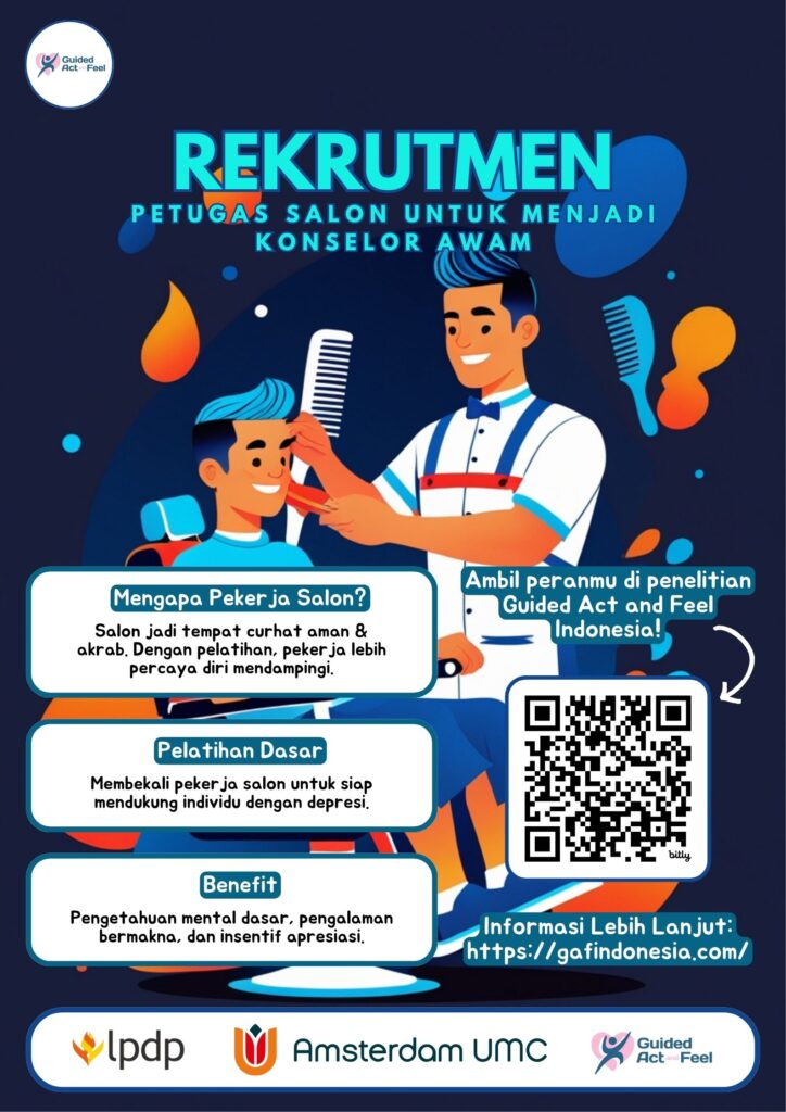 Kami dari Amsterdam University Medical Center sedang menjalankan sebuah proyek penelitian tentang kesehatan mental, khususnya untuk membantu orang yang mengalami depresi. Dalam proyek ini, kami ingin melibatkan rekan-rekan pekerja salon sebagai konselor awam atau pendamping bagi klien yang membutuhkan dukungan saat proses pemulihan berlangsung.